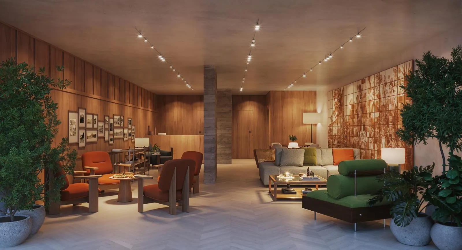 A fachada traduz o estilo carioca contemporâneo — urbano e sofisticado — enquanto o lobby abriga uma obra exclusiva do artista Arthur Grangeia, criando uma atmosfera de arte, cultura e acolhimento desde a entrada.