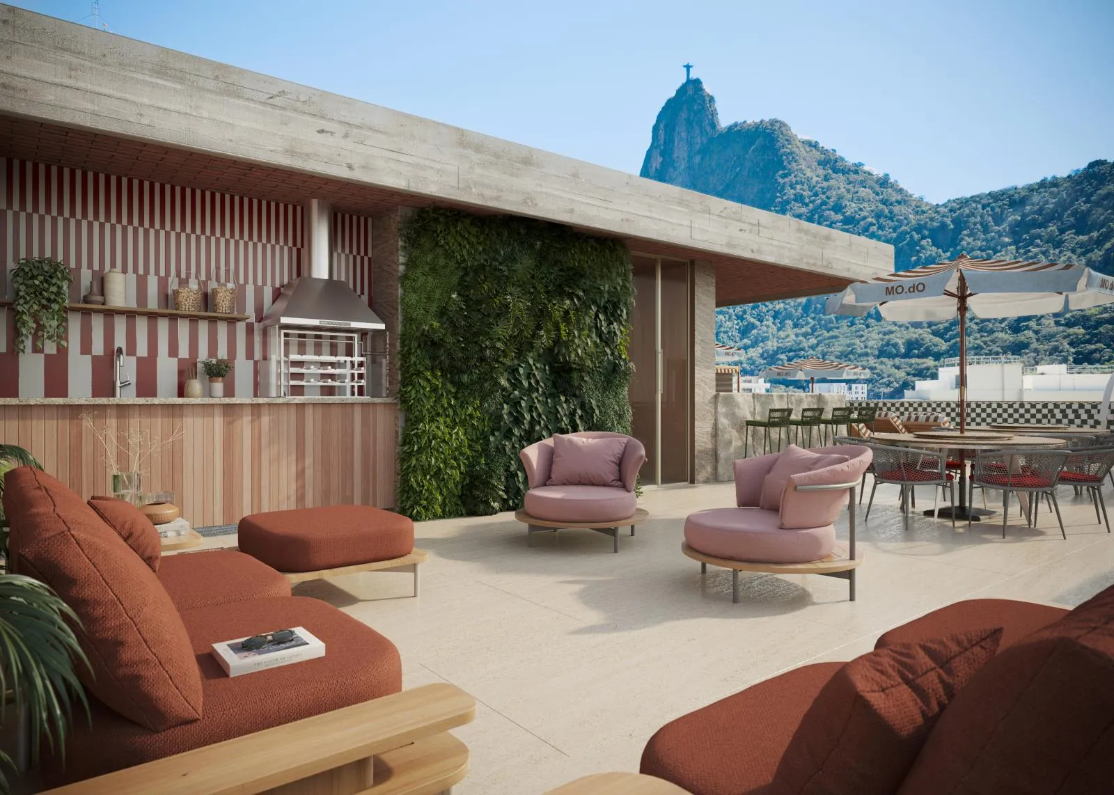 No rooftop, os moradores desfrutam de vista panorâmica para o Cristo Redentor e o Pão de Açúcar, em um ambiente de resort urbano com piscina, sauna, bar gourmet e lounge.